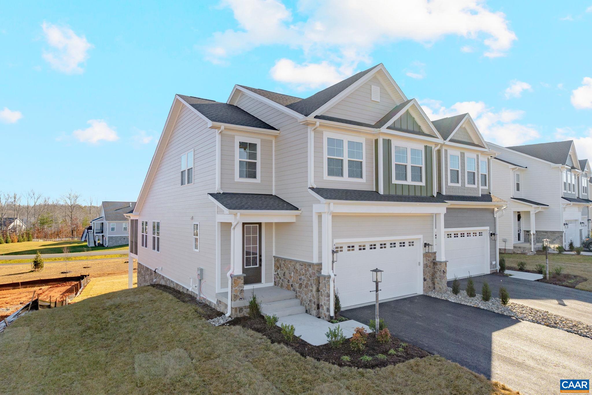 Welcome to the Grove at Brookhill, a peaceful neighborhood tucked into the woods yet just moments from Route 29 North in Charlottesville. This end unit Bayberry villa is currently under construction with an anticipated Spring 2026 completion. It offers easy main-level living with a spacious primary suite, private en suite bath, and generous walk-in closet. The kitchen features a walk-in pantry, soft-close cabinetry, and quartz countertops, opening to a light-filled family room with a gas fireplace and 12' ceilings. A mudroom and laundry area complete the main level. Upstairs includes two bedrooms, a full bath, an open loft, a pocket office, and plenty of storage. The fully finished walkout basement adds even more living space with a large rec room, an additional bedroom, and a full bath. It's a great setup for guests, hobbies, or movie nights. A large rear screened porch extends the living space outdoors. High-quality finishes like luxury vinyl plank and tile flooring and a two-car garage complete the home. Photos shown are of a similar home and are intended to illustrate layout and options. Actual features may vary.